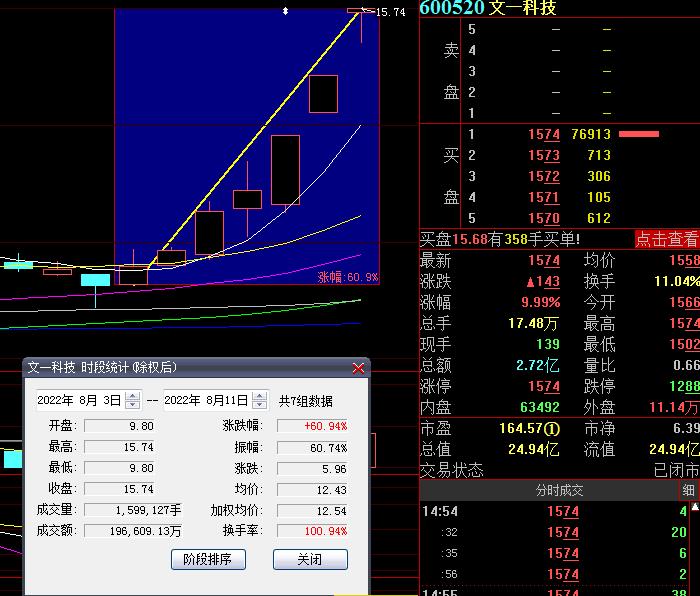 8月11日,熱門股文一科技再度漲停,截至收盤,報(bào)15.74元,走出3連板,實(shí)現(xiàn)7連漲,7日累計(jì)漲幅達(dá)60.94%。