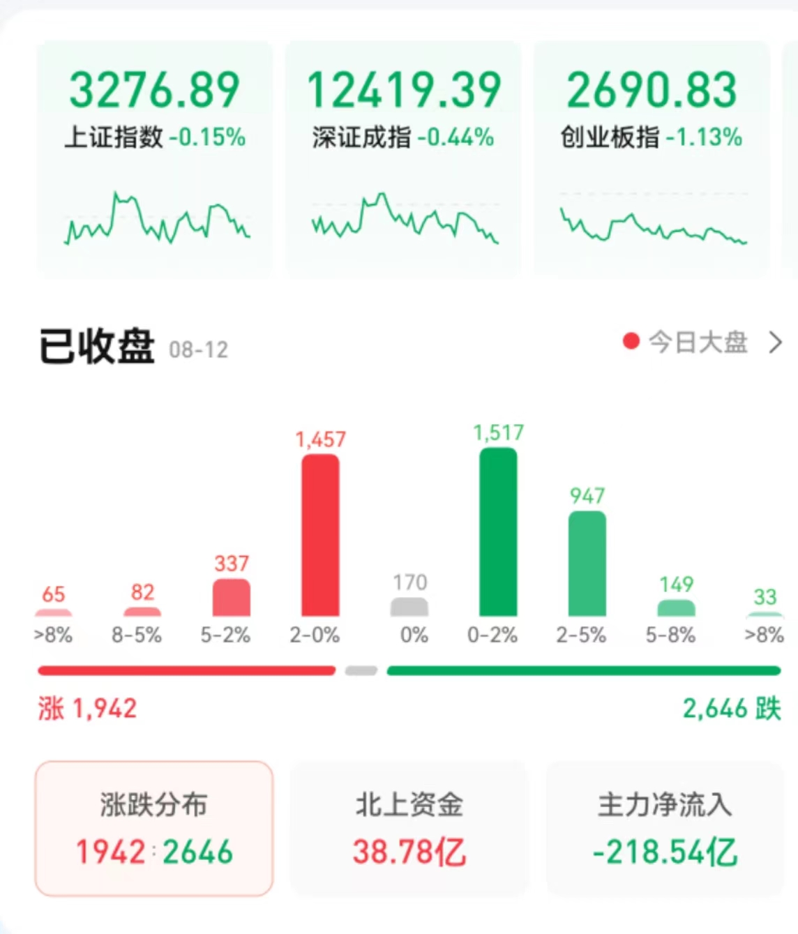 8月12日,三大股指集體收跌,截至收盤,上證指數(shù)跌幅達0.15%報3276.89點,深證成指跌幅達0.44%報12419.39點,創(chuàng)業(yè)板指跌幅達1.13%報2690.83點;兩市合計成交額9995億元,北向資金凈買入38.78億元??傮w來看,A股個股跌多漲少。