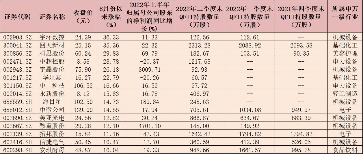 表:8月份以來漲幅超10%的QFII重倉股一覽