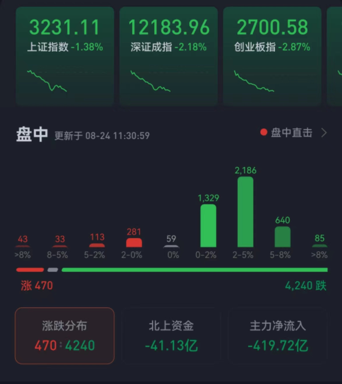 周三(8月24日),三大股指震蕩回落。截至上午收盤,三大股指跌幅均逾1%,上證指數(shù)跌幅達(dá)1.38%,報3231.11點(diǎn);深證成指和創(chuàng)業(yè)板指跌幅分別為2.18%和2.87%;滬深兩市合計成交額7384.7億元,總體來看,兩市個股跌多漲少,逾4000只個股下跌。