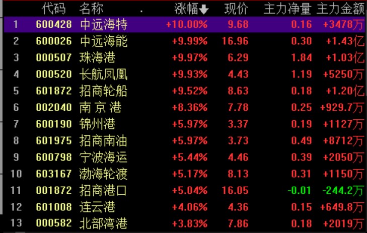 具體看,截至8月25日上午收盤,港口航運板塊領(lǐng)漲,漲幅為4.35%,其中,中遠海特、中遠海能、珠海港、長航鳳凰等4只個股集體漲停。