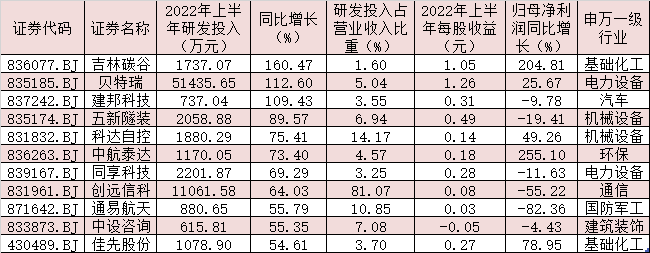 表:今年上半年研發(fā)投入實(shí)現(xiàn)同比增長(zhǎng)超50%的北交所公司
