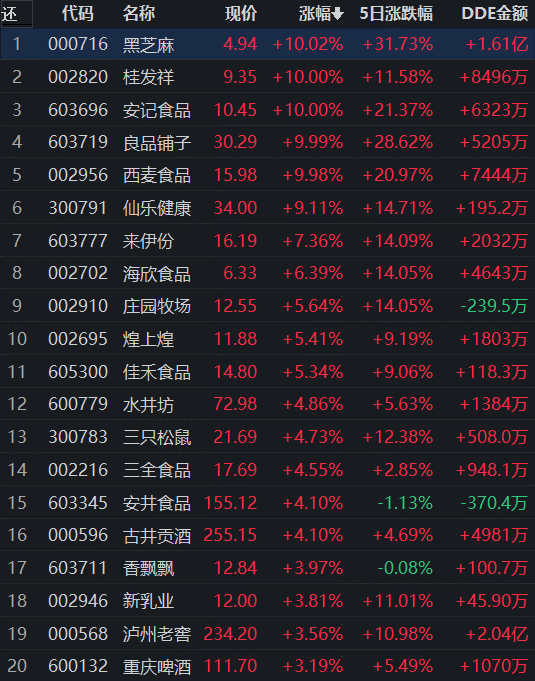 食品飲料行業(yè)117只交易個(gè)股中,有82只上漲,占比70.09%,其中,有6只個(gè)股漲停,11只個(gè)股漲幅超5%。其中,西麥?zhǔn)称窛q9.98%,報(bào)15.98元。該股自8月25日以來(lái),截至8月31日已連續(xù)5個(gè)交易日上漲,累計(jì)漲幅達(dá)20.97%。該股最新A股總市值達(dá)35.68億元,A股流通市值35.47億元。