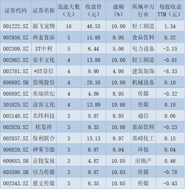 表:連續(xù)上漲3天且今日收盤(pán)漲停股一覽