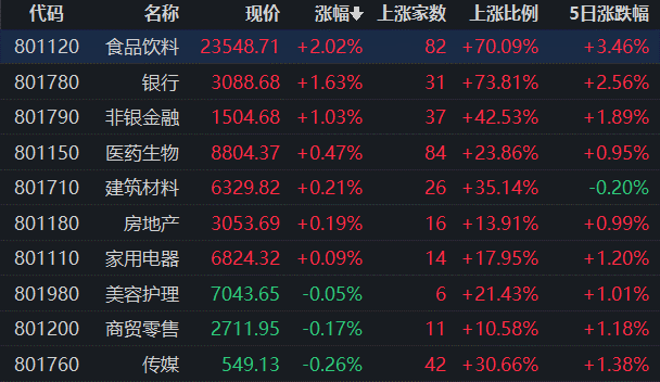 從申萬(wàn)一級(jí)行業(yè)看,31類(lèi)行業(yè)中有7類(lèi)上漲,占比22.58%,其中,食品飲料行業(yè)漲幅居前,為2.02%,此外,銀行和非銀金融漲幅也均超1%;跌幅最大的是電力設(shè)備,跌幅為4.78%。