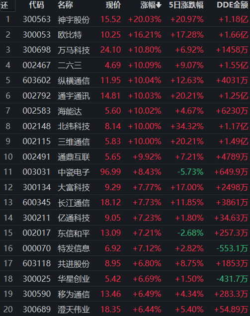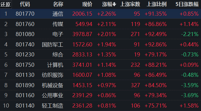 通信行業(yè)104只交易中的個(gè)股,有95只上漲,占比91.35%,其中,有11只個(gè)股漲停,42只個(gè)股漲幅超5%。