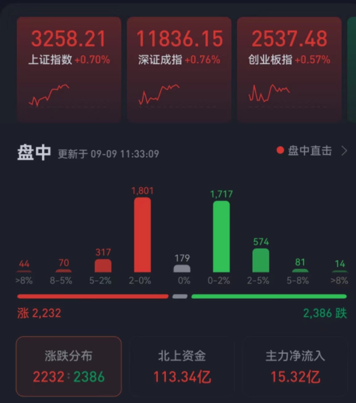 周五(9月9日),三大股指震蕩反彈,全線飄紅。截至上午收盤,上證指數(shù)漲幅達0.70%,報3258.21點;深證成指和創(chuàng)業(yè)板指漲幅分別為0.76%和0.57%;滬深兩市合計成交額5028.9億元。