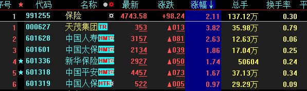 具體看,截至9月9日上午收盤,保險板塊走強,漲幅居首,達2.11%。其中,天茂集團、中國人壽等個股漲幅居前,均超2%。