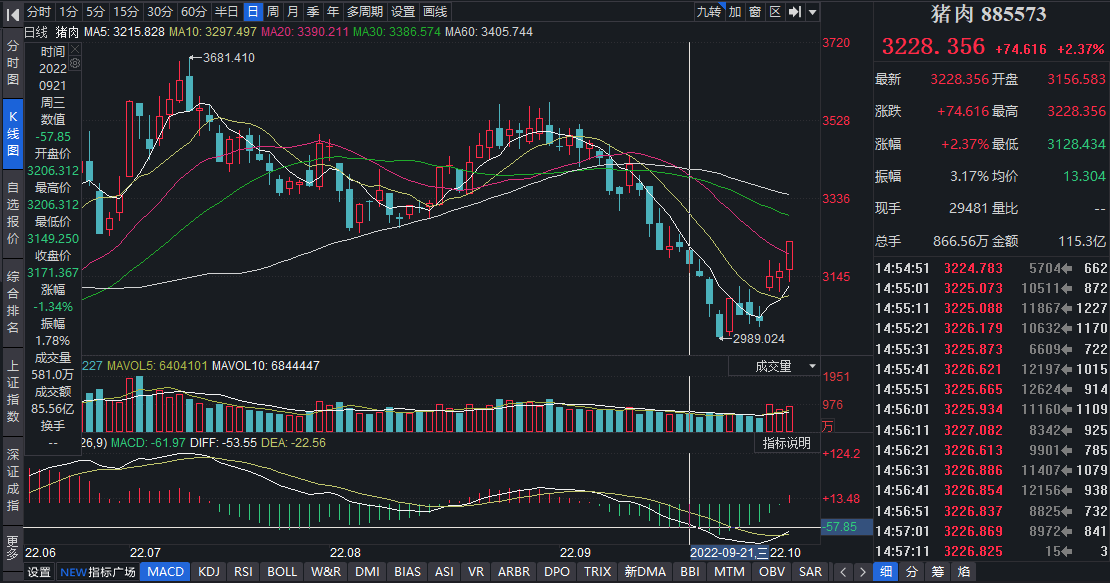 近期,生豬期現(xiàn)貨價格走強。期貨方面,10月12日,大商所2023年1月交貨的生豬期貨主力合約上漲1.12%,收于23935元/噸,期間創(chuàng)出年內新高24150元/噸。且10月10日至12日期間,該期貨合約累計漲幅達到5.95%?,F(xiàn)貨方面,中國養(yǎng)豬網(wǎng)養(yǎng)豬數(shù)據(jù)中心數(shù)據(jù)顯示:10月12日,生豬(外三元)目前價格為26.82元/公斤,價格較10月1日上漲了2.23元/公斤;生豬(內三元)目前價格為26.48元/公斤,價格較10月1日上漲了2.2元/公斤;生豬(土雜豬)目前價格為26.04元/公斤,較10月1日上漲2.18元/公斤。