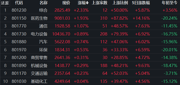 31類申萬(wàn)一級(jí)行業(yè)中,有14類上漲,占比45.16%,其中,綜合行業(yè)漲2.33%,居首;下跌方面,房地產(chǎn)行業(yè)居首,跌幅達(dá)1.13%。