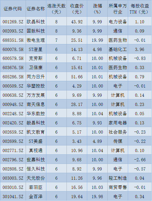 表:連續(xù)上漲6天且今日收盤漲停股一覽