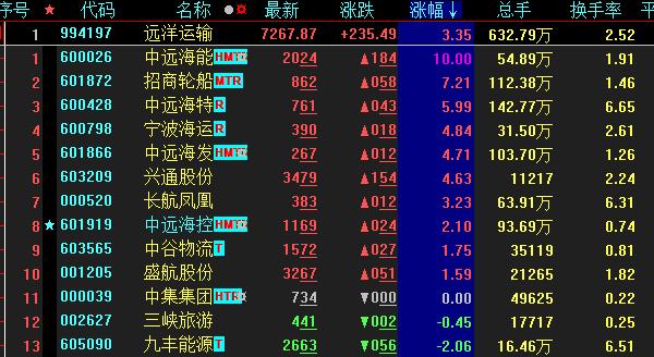 具體看,截至10月19日上午收盤,遠(yuǎn)洋運(yùn)輸板塊漲幅達(dá)3.35%,其中,中遠(yuǎn)海能漲停,緊隨其后的是招商輪船漲幅達(dá)7.21%。