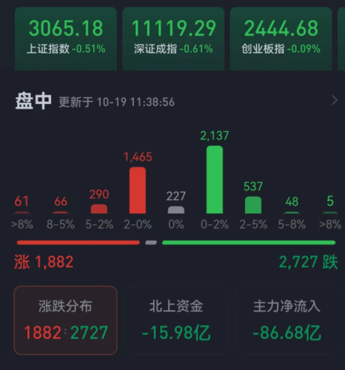 周三(10月19日),三大股指震蕩回落。截至上午收盤,上證指數(shù)跌0.51%,報3065.18點(diǎn);深證成指和創(chuàng)業(yè)板指分別下跌0.61%和0.09%;滬深兩市合計成交額4679.6億元,總體來看,兩市個股跌多漲少。