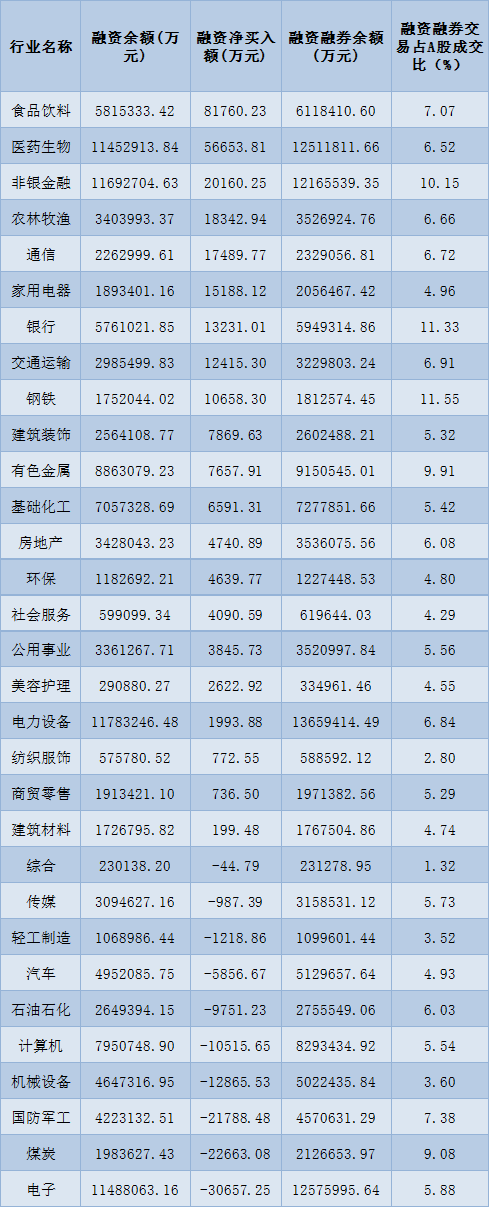 表:10月19日申萬一級行業(yè)兩融交易情況: