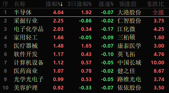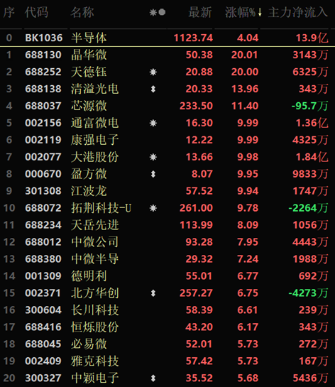 從漲幅居首的半導(dǎo)體行業(yè)看,截至10月20日11:30,該行業(yè)交易中的126只個股全線上漲,其中31只漲幅超5%。從資金流向看,該行業(yè)今天上午大單資金凈流入額達13.9億元,居行業(yè)第1位。