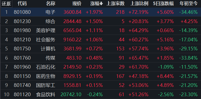 31類申萬一級行業(yè)中,有9類上漲,占比29.03%,其中,電子行業(yè)漲1.97%,漲幅居首;下跌方面,電力設(shè)備行業(yè)居首,跌幅達(dá)2.78%。