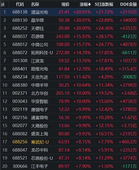 具體來看,同花順行業(yè)中半導(dǎo)體及元件行業(yè)漲幅達(dá)4.09%,獲得17.62億元大單資金的凈流入,居第一位。行業(yè)168只交易中的個股,有158只上漲,占比94.05%,其中,49只個股漲幅超5%。