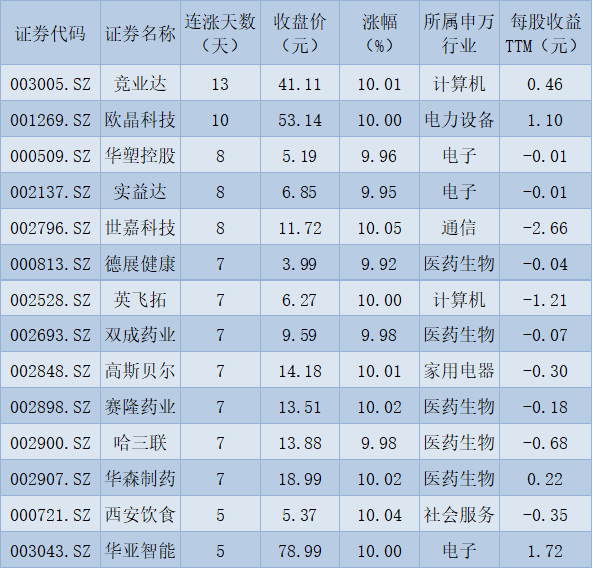 表:連續(xù)上漲6天且今日收盤漲停個股一覽