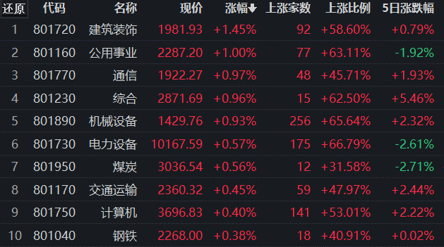 31類申萬(wàn)一級(jí)行業(yè)中,有15類上漲,其中,建筑裝飾行業(yè)漲1.45%,居首;下跌方面,美容護(hù)理行業(yè)居首,跌幅達(dá)3.05%。