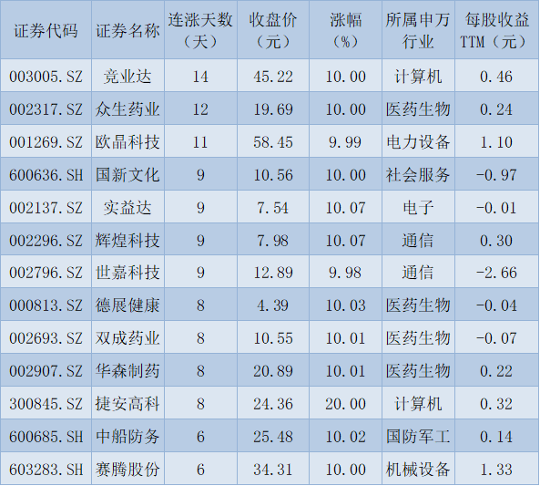 表:連續(xù)上漲6天且今日收盤(pán)漲停股一覽