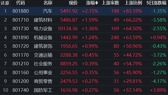 31類申萬一級行業(yè)中,有12類上漲,占比38.71%,其中,汽車行業(yè)漲2.15%,居首;下跌方面,醫(yī)藥生物行業(yè)居首,跌幅達(dá)2.26%。