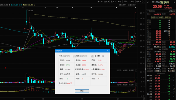 10月25日,雷爾偉以25.06元封漲停板報收,漲幅達(dá)20.02%。該股自10月11日以來,截至10月25日已連續(xù)11個交易日上漲,累計漲幅達(dá)41.18%。該股最新A股總市值達(dá)30.07億元,A股流通市值7.52億元。