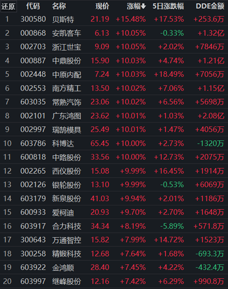10月25日,申萬一級行業(yè)中汽車行業(yè)領(lǐng)漲,漲幅達(dá)2.15%,獲得10.21億元大單資金的凈流入,居第一位。行業(yè)237只交易中的個股,有198只上漲,占比83.54%,其中,41只個股漲幅超5%。