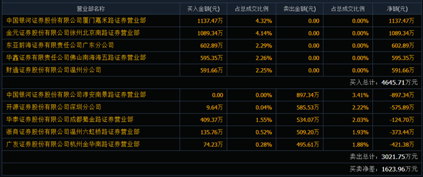 深交所公開信息顯示,當(dāng)日該股因日收盤價漲幅達(dá)20.00%、日換手率達(dá)36.70%上榜,營業(yè)部席位合計凈買入1623.95萬元。