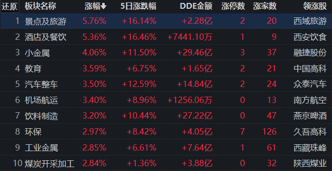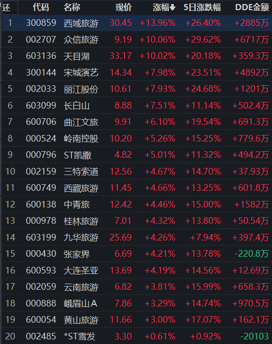 從早盤表現(xiàn)強(qiáng)勢(shì)的景點(diǎn)及旅游行業(yè)看,截至11月4日11:30,該行業(yè)交易中的20只個(gè)股全線上漲,其中9只漲幅超5%。從資金流向看,該行業(yè)今天上午大單資金凈流入額達(dá)2.28億元,居行業(yè)第25位。