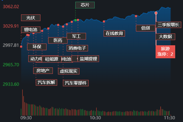 11月4日早盤,A股市場三大指數(shù)開盤后持續(xù)走高,早盤均漲超2%。截至上午11:30,上證指數(shù)漲2.09%,報(bào)3060.39點(diǎn);深證成指和創(chuàng)業(yè)板指漲幅分別為2.65%和2.61%;滬深兩市合計(jì)成交額6200.8億元,較前一交易日增長7.93%??傮w來看,A股市場個(gè)股漲多跌少,有56只個(gè)股漲停,跌停股0只。