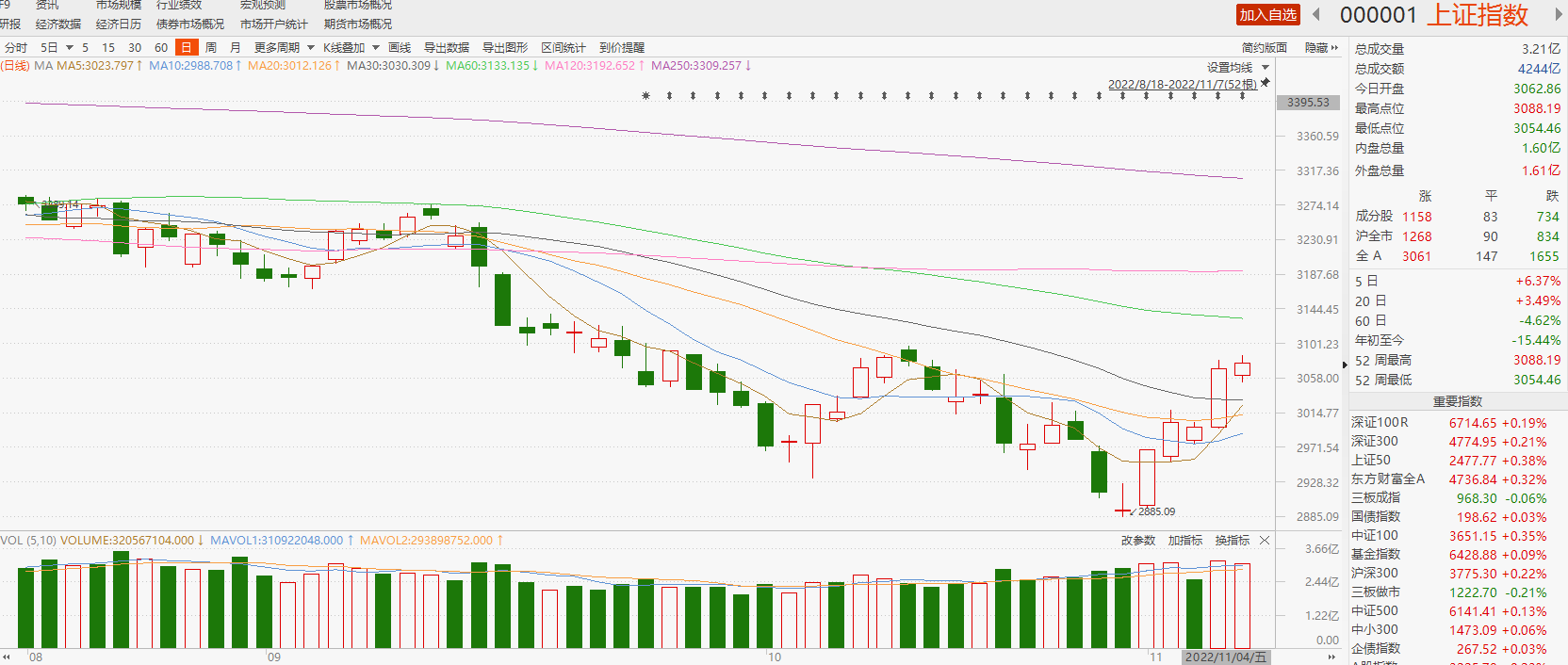 11月1日至11月7日的5個交易日,A股三大股指呈現(xiàn)震蕩反彈的態(tài)勢,走出日線六連陽,上證指數(shù)月內(nèi)累計漲6.37%,深證成指月內(nèi)累計漲7.8%,創(chuàng)業(yè)板指月內(nèi)累計漲8.37%。與此同時,11月4日和11月7日,滬深兩市合計成交額連續(xù)2個交易日突破萬億元。