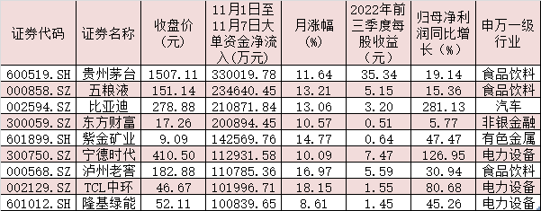表:11月1日至11月7日大單資金凈流入超10億元的個股