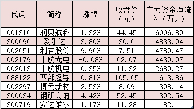 表:11月9日受到1000萬元以上主力資金追捧的大飛機概念股