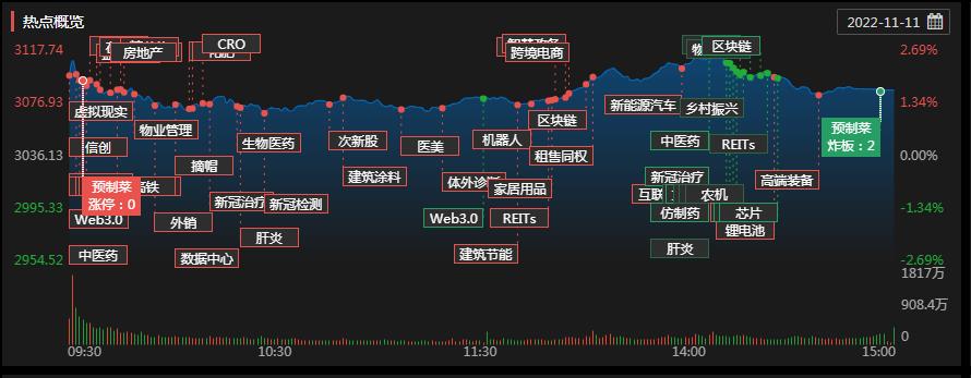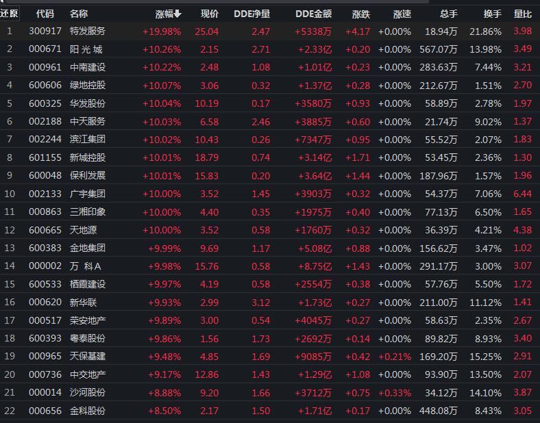 11月11日,房地產(chǎn)行業(yè)漲幅居首,達(dá)6.79%。其中,三湘印象、天地源、新城控股、保利發(fā)展、金地集團(tuán)、綠地控股、榮安地產(chǎn)、陽光城、廣宇集團(tuán)、華發(fā)股份、粵泰股份、棲霞建設(shè)、萬科A、新華聯(lián)、中南建設(shè)、中天服務(wù)、濱江集團(tuán)、特發(fā)服務(wù)等18只地產(chǎn)股集體漲停。