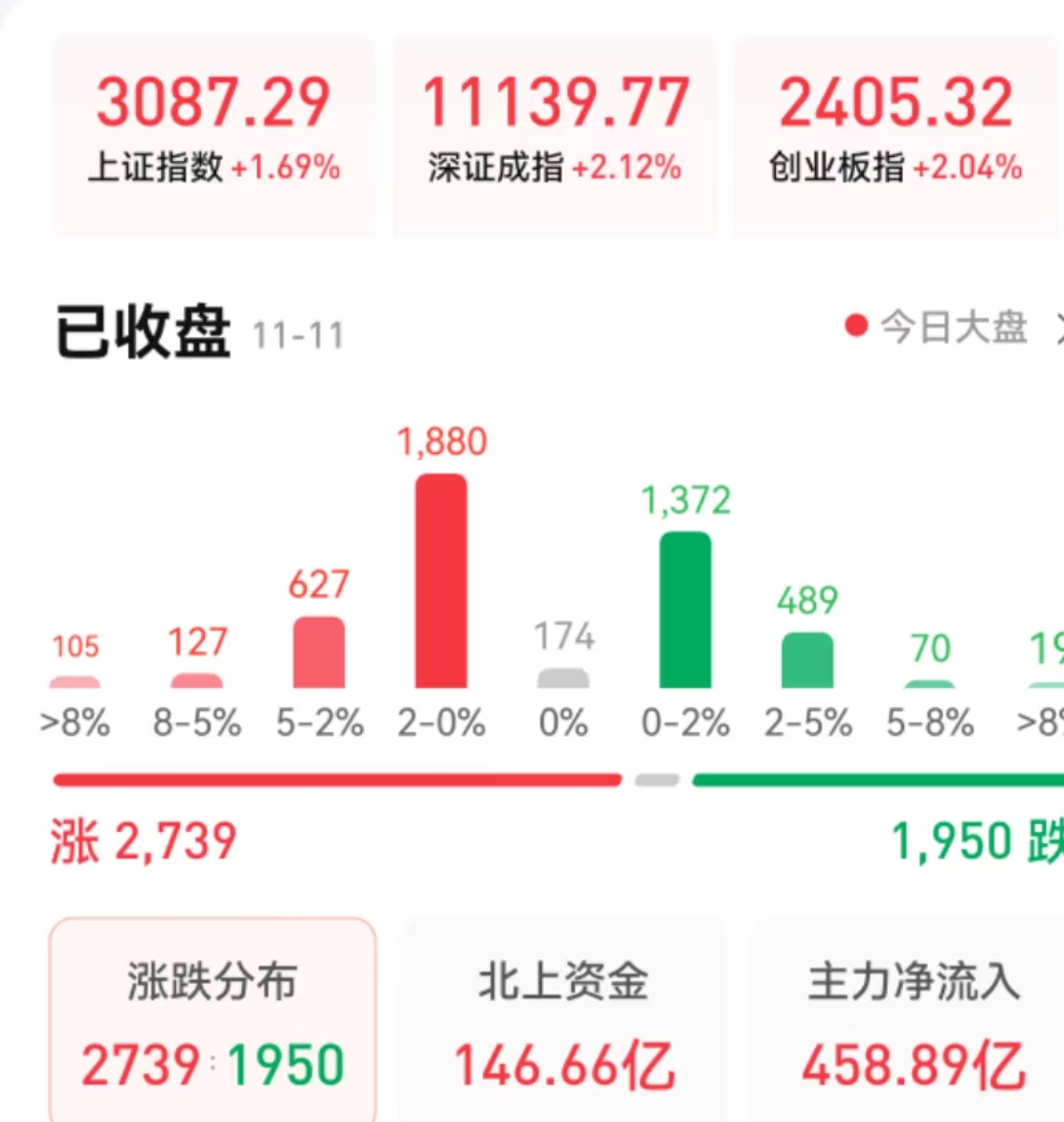 周五(11月11日),A股三大指數(shù)震蕩上揚(yáng)。截至收盤,上證指數(shù)漲1.69%報(bào)3087.29點(diǎn),深證成指漲2.12%報(bào)11139.77點(diǎn),創(chuàng)業(yè)板指漲2.04%報(bào)2405.32點(diǎn);兩市合計(jì)成交12231億元,北向資金凈買入146.66億元。總體來看,兩市個股漲多跌少。