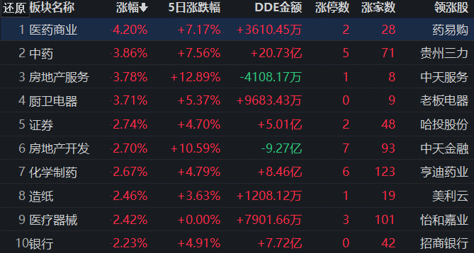 同花順行業(yè)方面,截至11月14日11:30,76類行業(yè)中48類上漲,占比63.16%,其中,醫(yī)藥商業(yè)漲幅居首,達(dá)4.20%,此外,中藥、房地產(chǎn)服務(wù)、廚衛(wèi)電器等行業(yè)漲幅也均超3%。機(jī)場航運(yùn)跌幅居首,達(dá)3.59%。