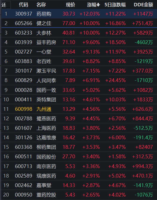 從早盤表現(xiàn)強(qiáng)勢的醫(yī)藥商業(yè)行業(yè)看,截至11月14日11:30,該行業(yè)交易中的31只個股有28只上漲,其中9只漲幅超5%。從資金流向看,該行業(yè)今天上午大單資金凈流入額達(dá)3610.45萬元,居行業(yè)第16位。