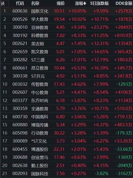 從早盤表現(xiàn)強勢的教育行業(yè)看,該行業(yè)自11:00開始拉升,至11:30,30分鐘內(nèi)漲幅達4.19%。截至11月18日11:30,該行業(yè)交易中的21只個股全線上漲,其中9只漲幅超5%。從資金流向看,該行業(yè)今天上午大單資金凈流入額達9510.22萬元,居行業(yè)第9位。