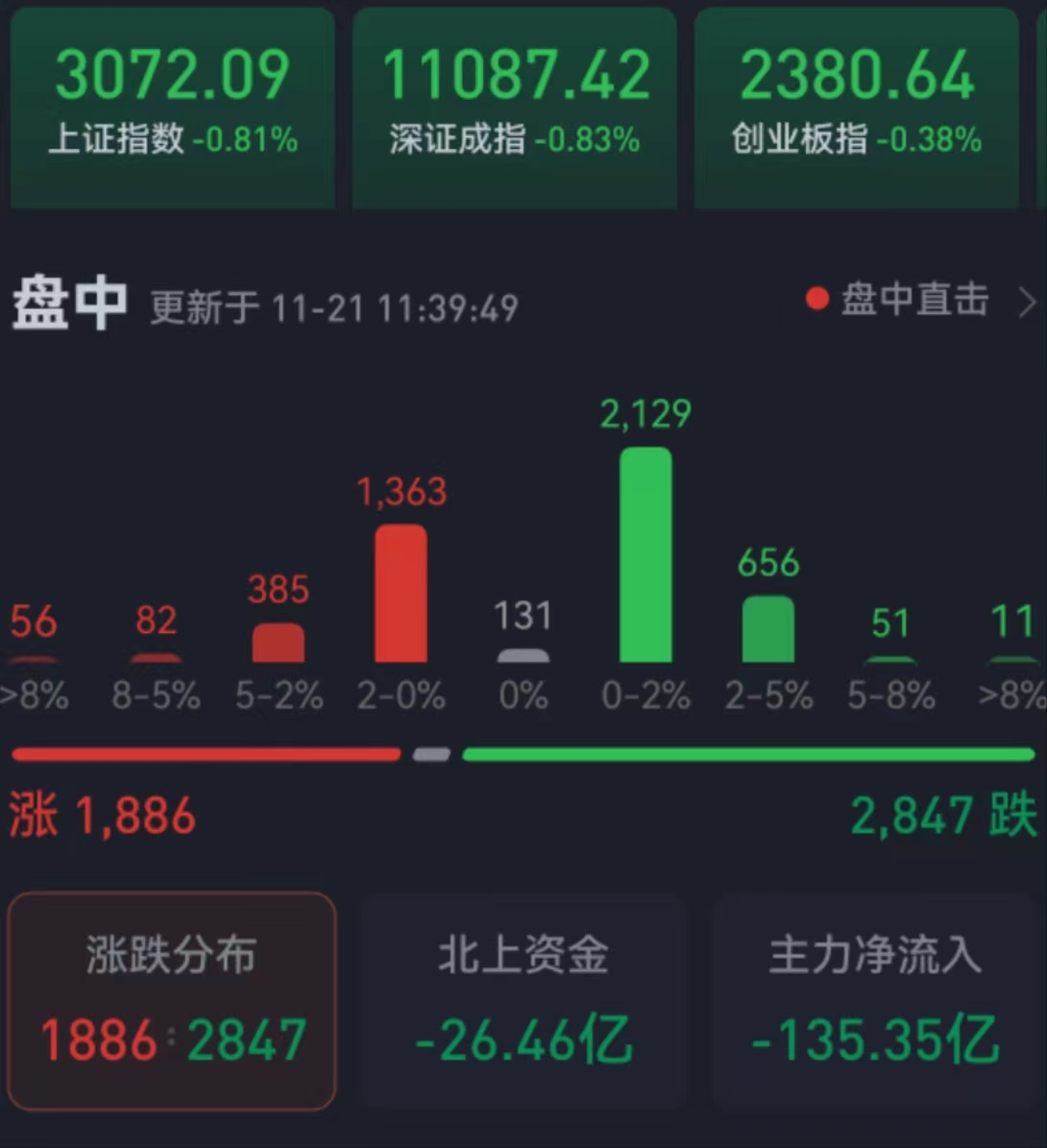 周一(11月21日),三大股指震蕩走弱,全線收綠。截至上午收盤,上證指數(shù)跌幅達(dá)0.81%,報(bào)3072.09點(diǎn);深證成指和創(chuàng)業(yè)板指跌幅分別為0.83%和0.38%;滬深兩市合計(jì)成交額5470.8億元,總體來看,兩市個(gè)股跌多漲少。