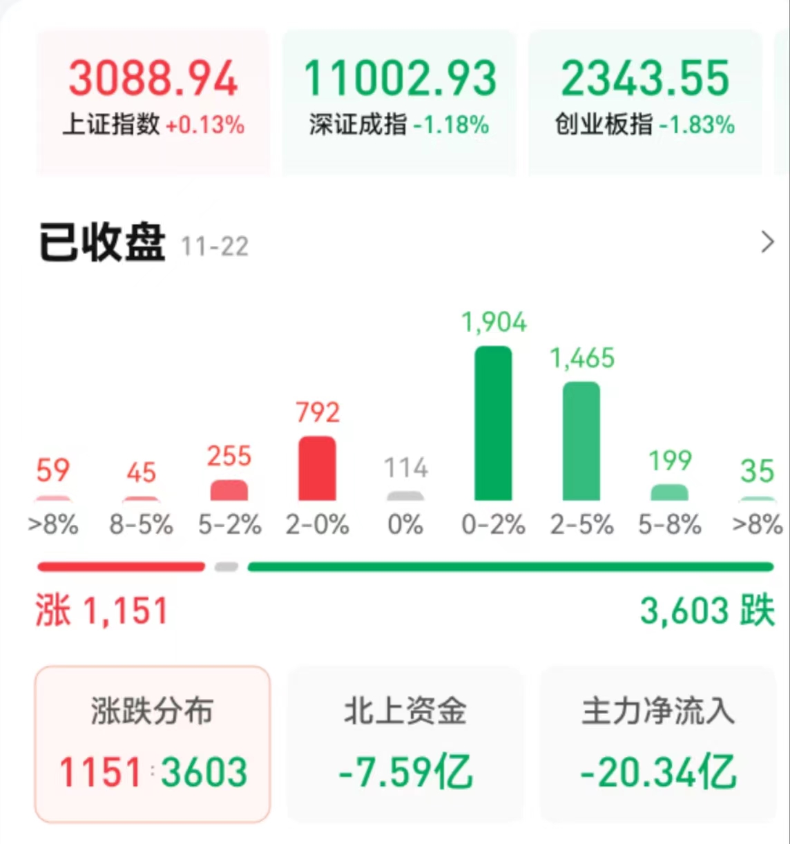 周二(11月22日)截至收盤(pán),上證指數(shù)漲0.13%報(bào)3088.94點(diǎn),深證成指跌1.18%報(bào)11002.93點(diǎn),創(chuàng)業(yè)板指跌1.83%報(bào)2343.55點(diǎn);兩市合計(jì)成交8846億元,北向資金凈賣(mài)出7.59億元??傮w來(lái)看,個(gè)股跌多漲少。