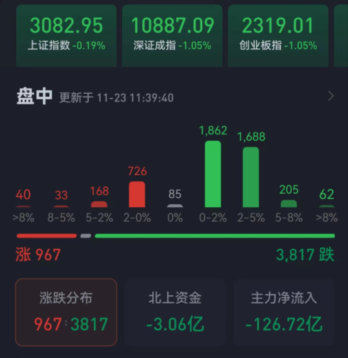 周三(11月23日),三大股指震蕩回落。截至上午收盤,上證指數(shù)跌幅達(dá)0.19%,報(bào)3082.95點(diǎn);深證成指和創(chuàng)業(yè)板指跌幅均為1.05%;滬深兩市合計(jì)成交額5363.4億元,總體來(lái)看,兩市個(gè)股跌多漲少。