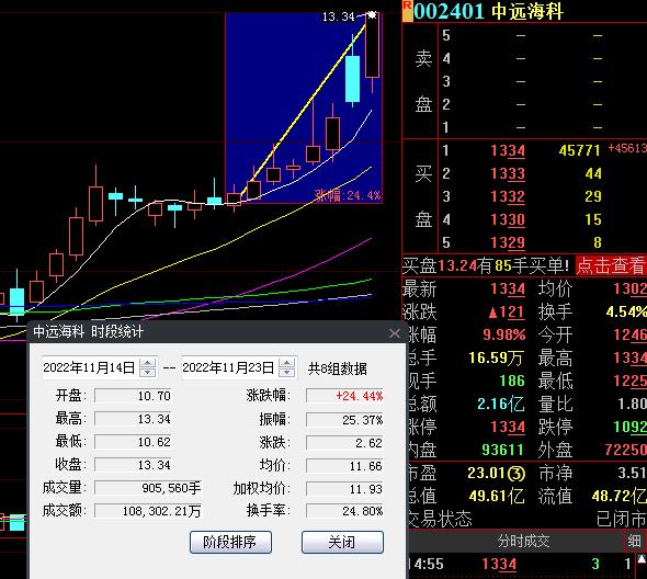 11月23日,熱門股中遠??茲q停,截至收盤報13.34元,自11月14日至今,連續(xù)8個交易日實現(xiàn)上漲,累計漲幅達24.44%。