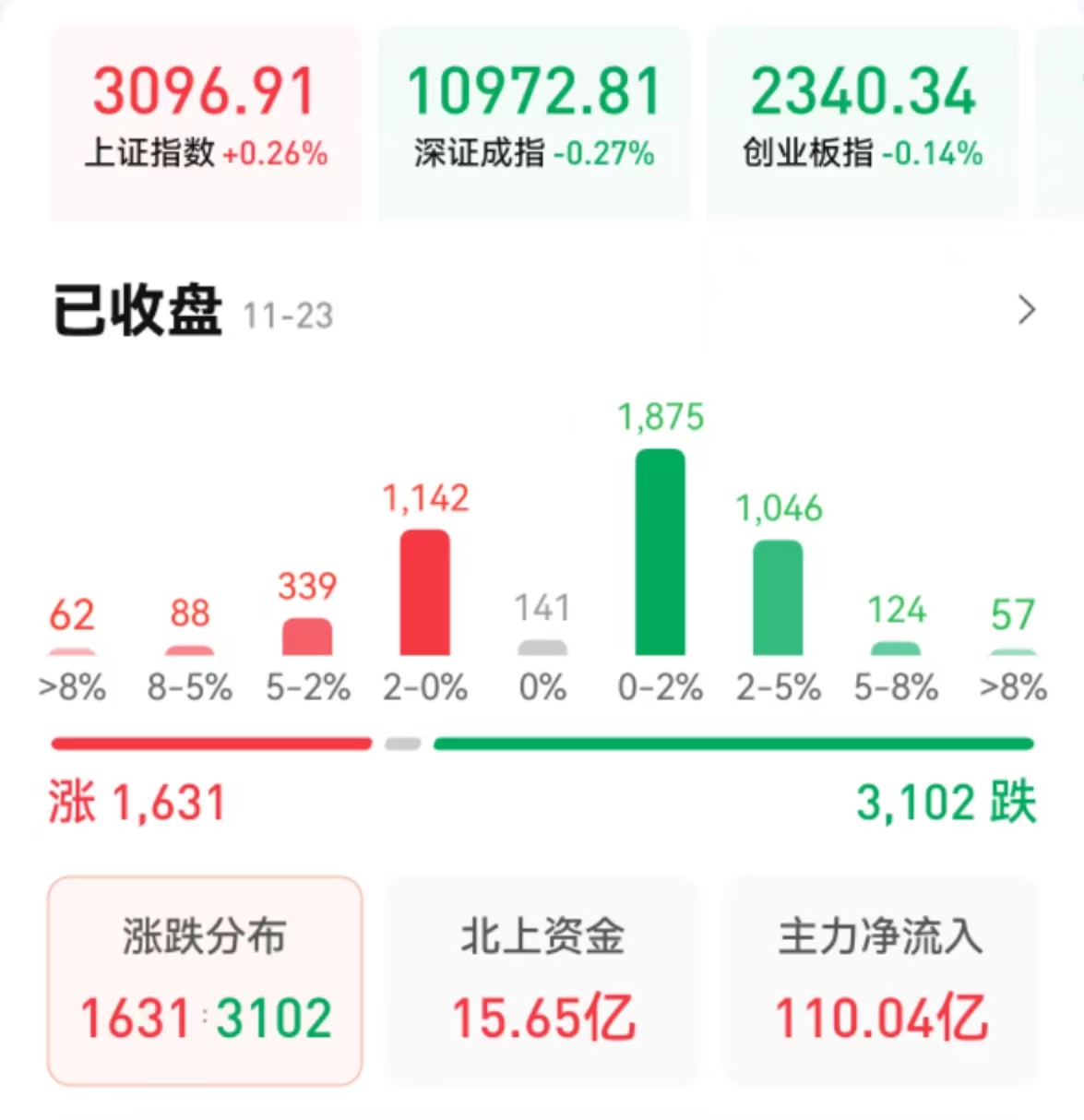 周三(11月23日),A股三大指數(shù)震蕩分化。截至收盤,上證指數(shù)漲0.26%報3096.91點,深證成指跌0.27%報10972.81點,創(chuàng)業(yè)板指跌0.14%報2340.34點;兩市合計成交8305億元,北向資金凈買入15.65億元??傮w來看,兩市個股跌多漲少。