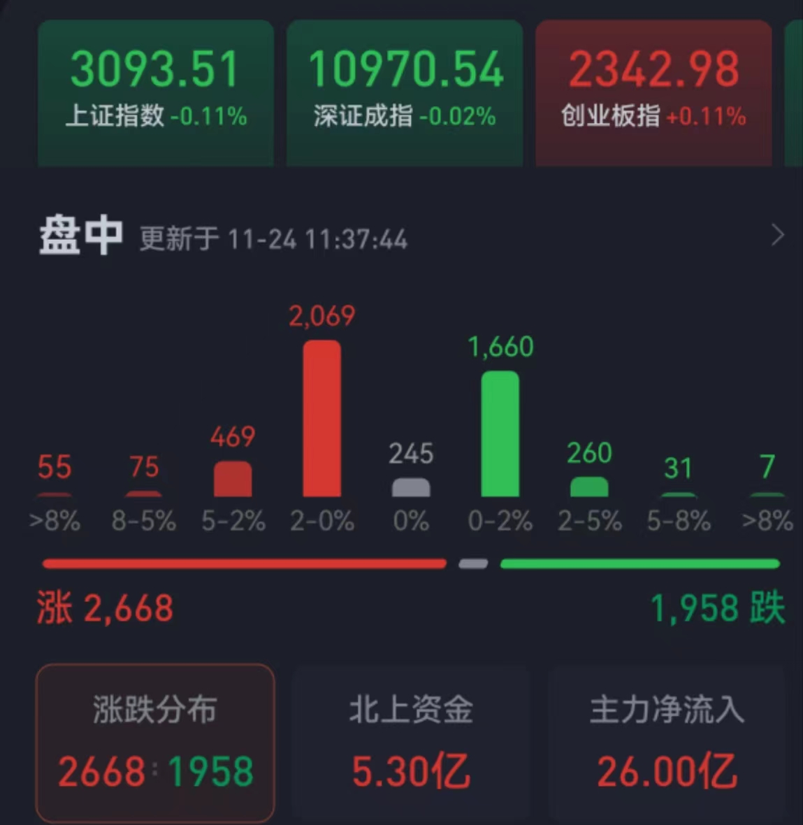 周四(11月24日),三大股指沖高后,震蕩分化,漲跌不一。截至上午收盤,上證指數(shù)跌幅達(dá)0.11%,報3093.51點;深證成指跌幅為0.02%,創(chuàng)業(yè)板指漲幅為0.11%;滬深兩市合計成交額4730.94億元,總體來看,兩市個股漲多跌少。
