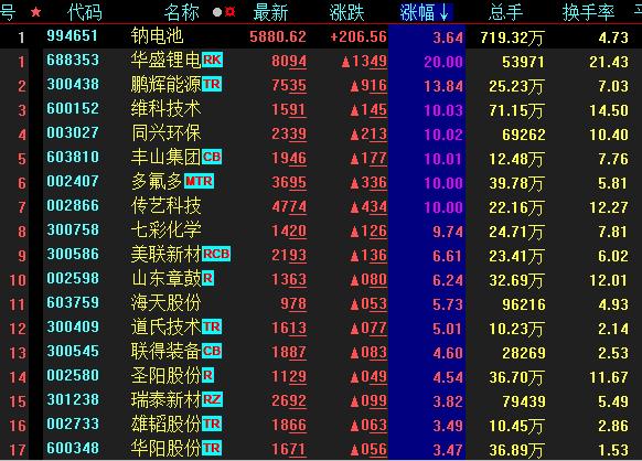 具體看,截至11月24日上午收盤,鈉電池板塊漲幅居首,達(dá)3.64%。其中,華盛鋰電20CM漲停,維科技術(shù)、同興環(huán)保、豐山集團、多氟多、傳藝科技等概念股集體漲停。