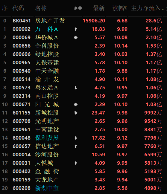 從早盤表現(xiàn)強勢的房地產(chǎn)開發(fā)行業(yè)看,截至11月29日11:30,該行業(yè)交易中的113只個股全線上漲,其中79只漲幅超5%。從資金流向看,該行業(yè)今天上午大單資金凈流入額達28.6億元,居行業(yè)第2位。