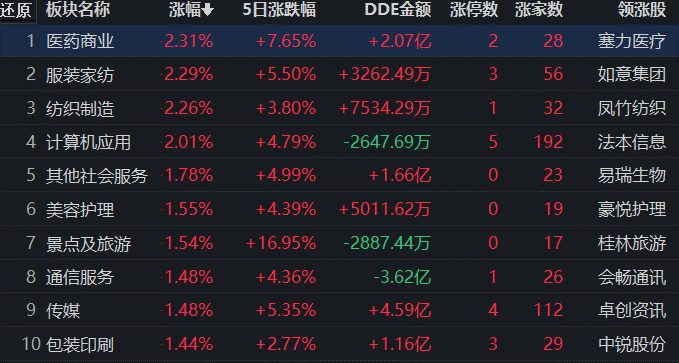 從早盤(pán)表現(xiàn)強(qiáng)勢(shì)的醫(yī)藥商業(yè)行業(yè)看,截至12月2日11:30,該行業(yè)交易中的31只個(gè)股,有28只上漲,其中3只漲幅超5%。從資金流向看,該行業(yè)今天上午大單資金凈流入額達(dá)2.07億元,居行業(yè)第5位。
