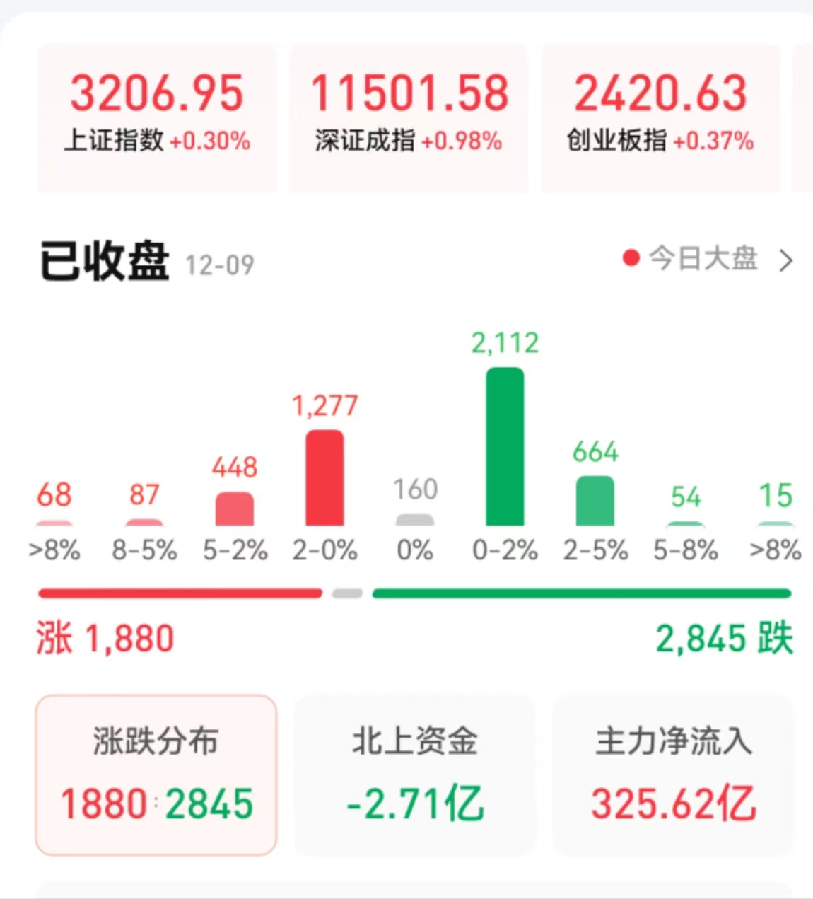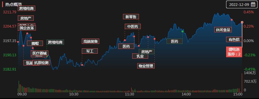 12月9日,A股三大指數(shù)震蕩攀升,全線收漲。截至收盤,上證指數(shù)漲0.3%報(bào)3206.95點(diǎn),重返3200點(diǎn)整數(shù)關(guān)口之上,深證成指漲0.98%報(bào)11501.58點(diǎn),創(chuàng)業(yè)板指漲0.37%報(bào)2420.63點(diǎn);兩市合計(jì)成交金額達(dá)10091億元,北向資金凈賣出2.71億元??傮w上看,A股個股跌多漲少,市場分化加劇。