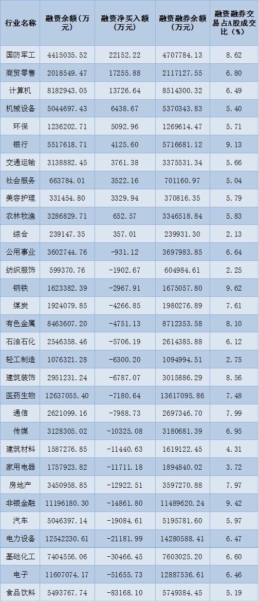 表:12月9日申萬一級行業(yè)兩融交易情況: