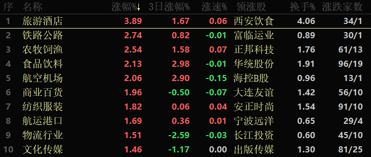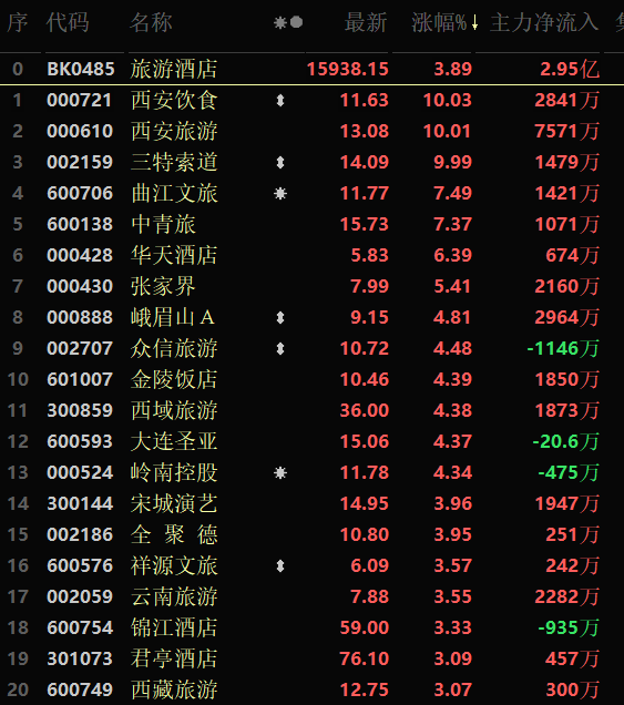 從早盤表現(xiàn)強勢的旅游酒店行業(yè)看,截至12月13日11:30,該行業(yè)交易中的35只個股,有34只上漲,其中7只漲幅超5%。從資金流向看,該行業(yè)今天上午大單資金凈流入額達2.95億元,居行業(yè)第4位。